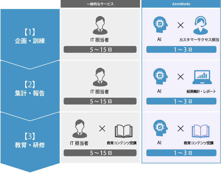 AironWorksはAIを使用した高度な標的型メール訓練を実現し、ヒヤリハット体験により従業員のリテラシーを向上させます。