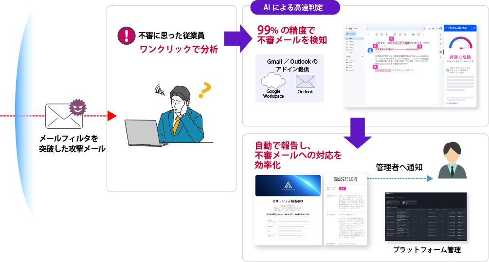フィルタリングをすり抜けた脅威も最終段階で遮断します。従業員が不審を感じたらワンクリックで報告でき、日々の気付きがセキュリティ意識の向上に繋がります。