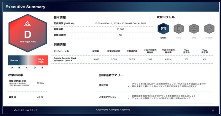 高度化するフィッシング攻撃に対して、組織が現時点でどの程度のセキュリティ意識があるのか客観的な定量的評価を行うことが可能です。