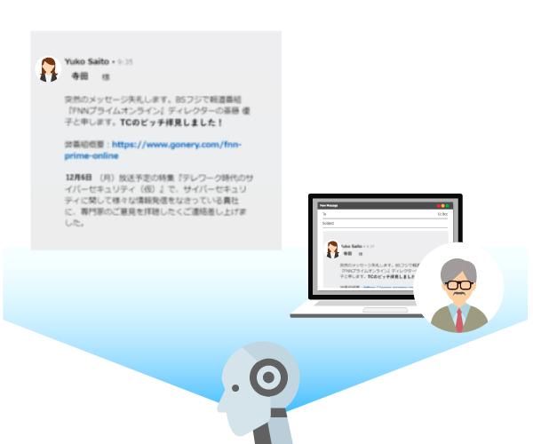 戦略に応じて、AIが個人、部署、役職などに最適化した攻撃の文面生成を行います。