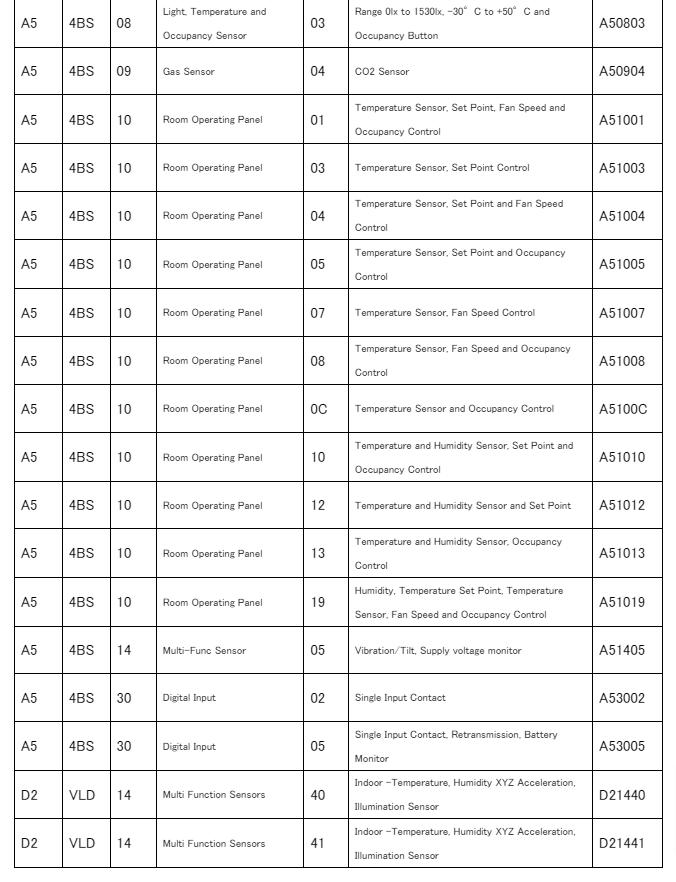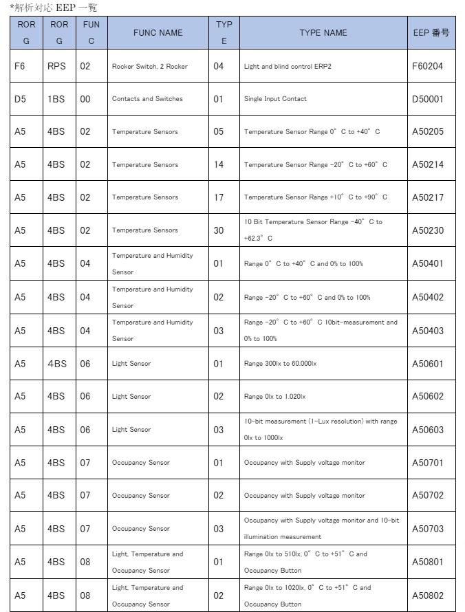 2024.3.28時点でSurfGateが対応しているEnOceanデバイスの EPP一覧。