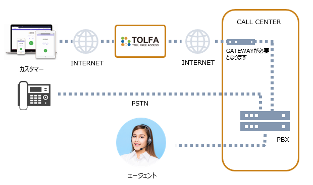 TOLFAは、インターネット回線を利用してお客様とコールセンターのオペレータとの無料通話を実現するクラウドサービスです。既存の電話設備やご利用中の電話システム基盤を変更する必要がなく、TOLFAの費用負担だけで利用開始できます。問い合わせをするお客様は、アプリケーションをインストールする必要がなく、ブラウザで閲覧しているWEBサイトからワンクリックで発信ができるため、インターネット環境があればTOLFAサービスを介してコールセンターと無料通話することができます。また、既存のPSTN(電話回線)網も並行して継続利用することができるため、新規経路としてインターネット経由の流入顧客を確保できます。