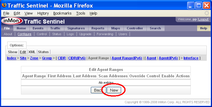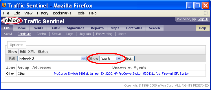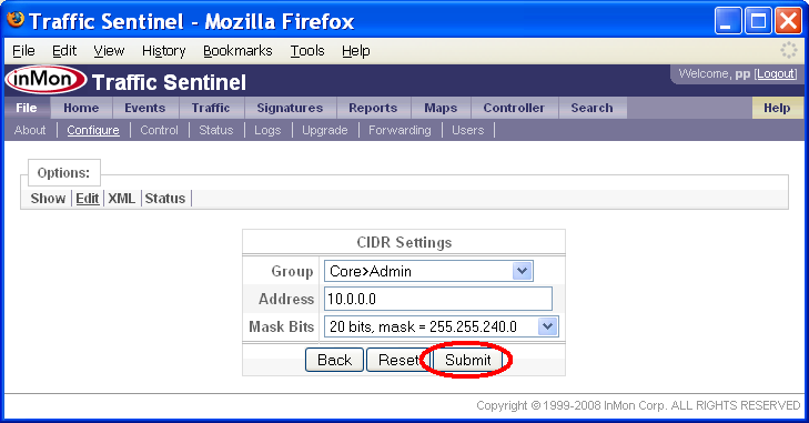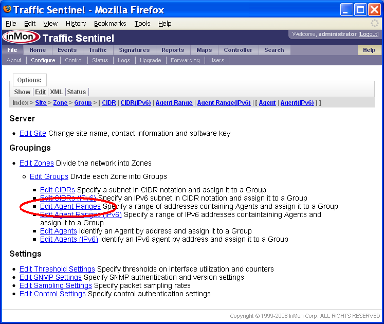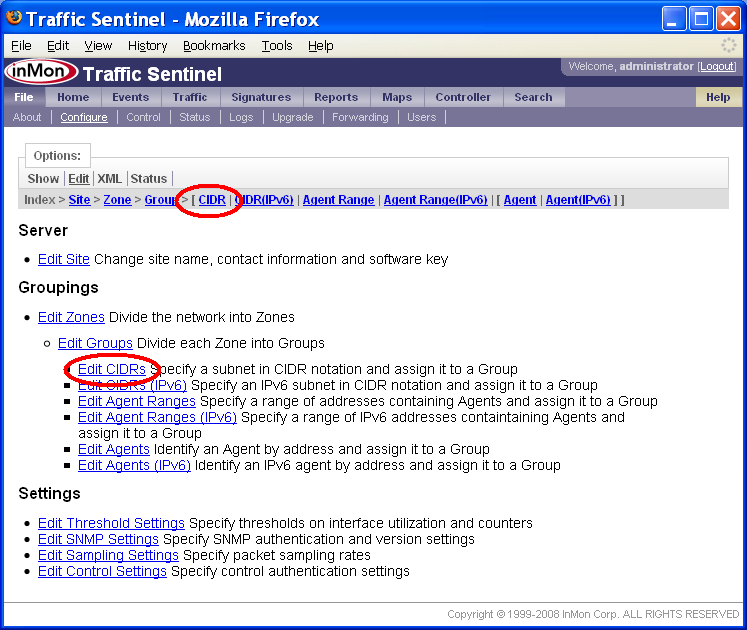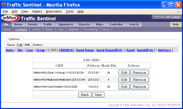 この例では、各グループに1つかそれ以上の /20 CIDRが割り当てられています。「キャッチオール」グループを定義しておくと、ローカル・アドレスが正しく識別されていることを確認するのに便利です。この場合には、10.0.0.0/8 CIDRを含んだ「Unassigned」ゾーンおよびグループを作成できます。アドレスが最も限定的なCIDRに割り当てられることを思い出して下さい。すなわち、他のどのグループにも属さないローカル・アドレスだけが、Unassignedグループに表示されるのです。全てのローカル・アドレスが正しく識別されていることを確認するだけでなく、他の点でも、Unassignedグループは役に立ちます。もしTraffic SentinelがUnassignedグループのアドレスからのネットワーク・トラフィックを検出したら、アドレスの隠しブロックが働いていることを意味します。もしUnassignedグループへのネットワーク・トラフィックが検出されたら、誰かがあなたのアドレス・スペースをスキャンしている可能性があります。このことは、セキュリティー・アラートとして役立ちます。 「マルチキャスト」ゾーンおよびグループは、Traffic Sentinelの初期コンフィグレーション中に自動的に作成されます。IPマルチキャスト・トラフィックは、CIDR 244.0.0.0/4によって識別されます。マルチキャスト・グループによって、マルチキャスト・トラフィックのレポートが容易になり、マルチキャスト・トラフィックが確実にローカル・トラフィックとして処理されるようになります。 File>Configure>Edit(ファイル>設定>編集)ページで、グループにCIDRを割り当てます。下記の例では、上述の大学を例に取り、CIDRを追加します。 ページ上端のCIDRリンクをクリックするか、または、ページのGroupings(グルーピング)セクションのEdit CIDRs(CIDRの編集)リンクをクリックします。 New(新規)ボタンをクリックして、新規CIDRを追加します。 注: Zone 1ゾーン、Group 1グループ内の10.0.0.91/24 CIDRは、Traffic Sentinel初期コンフィグレーションファイルにデフォルトで追加されています。これは単に、Traffic Sentinelが存在するサブネットで、テーブル内のRemove(削除)ボタンをクリックすれば削除できます。 Group(グループ)を選択し、CIDRのAddress(アドレス)とMask Bits(ビット・マスク)コンポーネントを指定します。この例では、グループは、Core>Admin(すなわち、コア・ゾーン内のAdminグループ)で、CIDR 10.0.0.0/20を追加しようとしています。したがって、アドレスは、10.0.0.0になり、マスクは20 bits, mask = 255.255.240.0です。Submit(実行)ボタンをクリックして、CIDRを作成します。 このステップを繰り返して、全てのCIDRをサイトに追加します。 あるアドレスがどこに含まれるかを調べるには、Search>Host(検索>ホスト)ページが便利です。 この例では、アドレス10.0.0.25を検索し、そのアドレスがCore(コア)ゾーンのAdminグループ内にあることが分かりました。Location(ロケーション)値、InMon>HQ>Zone 1>Group 1>ProCurve Switch 5406zl>A15から、このホストをネットワークに接続しているスイッチとスイッチ・ポート、スイッチが割り当てられたゾーンおよびグループが分かります。 注: この例では、スイッチはGroup 1グループ内に表示されているのに対し、それに接続されたホストは、Adminグループ内に表示されています。スイッチのロケーションは、「5.3 エージェントをグループに割り当てる」に述べるルールに従って決定されるのに対し、ホスト・アドレスのトラフィックは、CIDRによってグループ分けされます。多くの場合、ホストとスイッチを同じグループに分けるのが理にかなっていますが、これが不可能であったり、あるいは、不合理であったりするような場合もあるかもしれません。ネットワーク・トラフィックを企業の職務によって分類しながら(例えば、製造、販売、サポートなど)、スイッチを地理的に整理するのが(例えば、A棟、2階など)、便利なこともあるかもしれません。 7. エージェントをグループに割り当てるサイトをゾーンとグループに分割したら、次は、ネットワーク・デバイスを、それぞれの正しいグループに割り当てます。 グループには、エージェント、エージェント・レンジ、CIDR定義を含めることができます。エージェントが検出されると、そのエージェントのIPアドレスに基づいて、グループに割り当てられます。エージェントをどのグループに割り当てるかは、下記の優先順位ルールによって決まります。