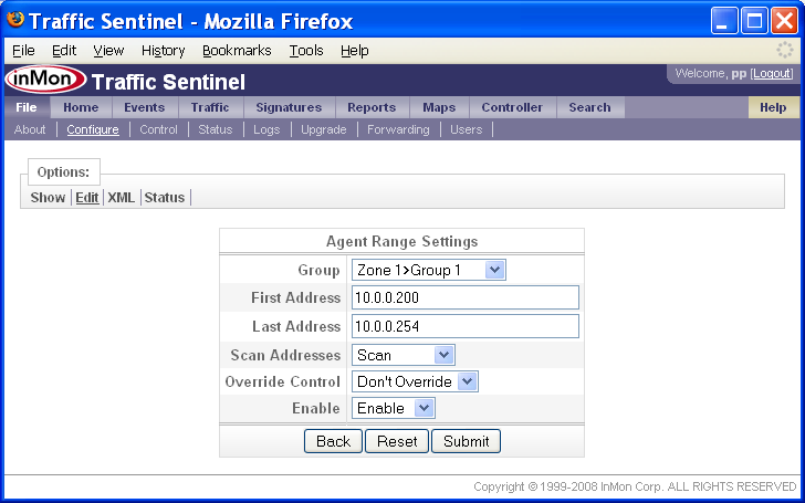 注: ほとんどのアプリケーション、ほとんどのネットワークでは、デフォルトのサンプリング・レートを変更する必要はありません。トラフィック・レベルが著しく高い場合には、サンプリング・レートの分母を大きくして下さい(例えば、10Gb/sリンクに対して、1/2000ではなく1/5000を用いるなど)。 Traffic SentinelにsFlowデータ、NetFlowデータ、JFlowデータ、またはIPFIXデータを送るようスイッチをコンフィグレーションする際には、正しいポートに、各プロトコルが送信されるよう確認して下さい。File>Status(ファイル>ステータス)ページに、それぞれのタイプのデータを受け取るのに用いるポートがリストアップされています。 注意: Traffic Sentinelと、それがモニタリングしているスイッチの間のファイアウォールが、これらのポートへのパケットの通過を許可することを確認して下さい。また、ICMPエコー(ping)パケットおよびSNMPパケット(UDP:161)についても、ファイアウォールによって許可されなければなりません。 3. スイッチを検出するsFlowデータ、NetFlowデータ、JFlowデータ、またはIPFIXデータを受け取ったら、Traffic Sentinelは、自動的にデバイスを「検出」します(注: スイッチからTraffic Sentinelにデータが送信されるよう、スイッチをコンフィグレーションする必要があります。)。全てのデバイスが、このカテゴリーに該当する場合は、3.2エージェントに進んでください。 SNMPを用いたモニタリングのみが可能なデバイスや、あるいはSNMPを用いてコンフィグレーションするデバイス(sFlow MIBをサポートしているsFlowデバイスなど)を使用する場合は、これらのデバイスが検出される前に、Traffic Sentinelの検出設定をコンフィグレーションしなければなりません。下記の3.1エージェント範囲を参照して下さい。 3.1 エージェント範囲 Traffic Sentinelは、アドレスのレンジをスキャンして、自動的にネットワーク・デバイスを検出するメカニズムを備えています。ネットワーク・コンフィグレーションを編集して、「エージェント範囲」を作成する必要があります。最初に、File>Configure>Edit(ファイル>設定>編集)ページを開きます。 Edit Agent Ranges(エージェント範囲の編集)リンクをクリックして、エージェント・レンジのテーブルにアクセスします。 New(新規)ボタンをクリックして、新規のエージェント範囲を作成します。 Agent Range Settings(エージェント範囲の設定)フォームでは、下記の設定を行います。 · Group(グループ) 管理グループ。今は、この設定はデフォルトのままにしておきます。ステップ5でグループの定義を行う際に設定を変更できます。 · First Address(最初のアドレス) 範囲の最初のアドレス。 · Last Address(最後のアドレス) 範囲の最後のアドレス。 · Scan Addresses(アドレスのスキャン) Traffic Sentinelが範囲内の全てのアドレスをテストし、スイッチを検出できるよう、Scan(スキャン)に設定します。 · Override Control(上書き制御) sFlow MIBは、ネットワーク管理アプリケーションが使用中の設定を特定し、それらを他のネットワーク管理アプリケーションによる変更から保護するためのリザベーション・メカニズムを備えています。通常は、Don't Override(オーバーライドしない)に設定しておきます。こうすることで、他のアプリケーションが行った設定が尊重されます。sFlowデータの収集に用いるアプリケーションがTraffic Sentinelだけなら、この値をOverride(オーバーライドする)に設定してもかまいません。これによって、Traffic Sentinelが、ネットワークのモニタリングに必要な一切のリソースを占有できます。 · Enable/Disable(有効化/無効化) アドレス・レンジのスキャンを有効にし、このレンジに該当するエージェントのモニタリングを可能にするには、この値をEnable(有効化)に設定します。このレンジのエージェントのモニタリングをブロックしたい場合は、Disable(無効化)に設定して下さい。 この例では、スイッチは、10.0.0.200から10.0.0.254までのレンジのアドレスに割り当てられています。フォームには、このレンジのエージェントのスキャンに必要な設定が表示されます。 3.2 エージェントTraffic Sentinelは、それぞれのスイッチまたはルーターを、固有IPアドレスあるいは「エージェント」アドレスによって識別します。「エージェント」という用語は、一般に、SNMP リクエストの処理を担当するマネージド・スイッチまたはルーター上のソフトウェア・エンティティを意味します。Traffic Sentinelでは、この語は、Traffic Sentinelがモニタリングするデバイスを意味します。 1つのデバイスが、多くのIPアドレスを持っている場合があります。例えばルーターの場合は、通常、ルートされるインターフェースごとに、それぞれ1つずつ、IPアドレスがあります。下記のルールに従って、どのIPアドレスを固有のエージェント・アドレスとして用いるかを決めます。 · SNMP Traffic Sentinelは、SNMPを用いてエージェントの情報を取得します。スイッチからTraffic Sentinelに情報を流すsFlowやNetFlow、