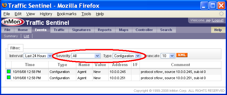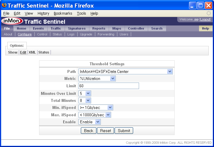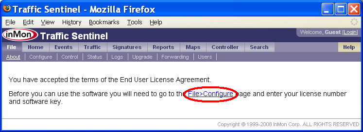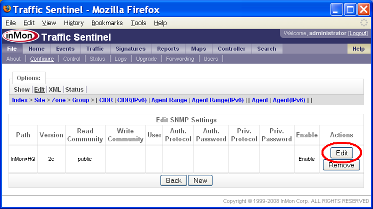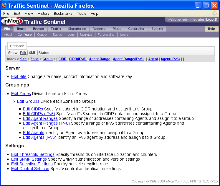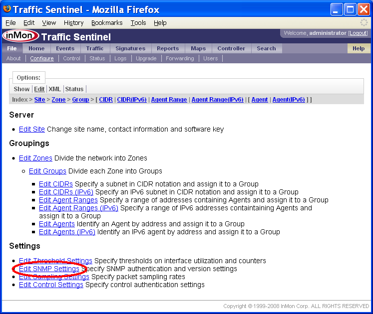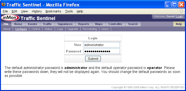 Traffic Sentinelの設定 - ステップバイステップ・ガイドTraffic Sentinelは、大規模なマルチレイヤー・スイッチング・ネットワーク、ルーティング・ネットワークにおけるネットワーク活動をモニタリング、管理するための強力なツールです。正常に動作させるには、初期コンフィグレーションが必要です。 Traffic Sentinelを完全にコンフィグレーションするには、次のステップに従って下さい。 1. 初期コンフィグレーション 3. スイッチを検出する 8. 閾値設定 9. イベントの転送 10. スケジュール・レポート 13. ユーザー・アカウントを作成する 14. ダッシュボードをカスタマイズする 全てのステップを実行することを推奨します。これによって、本製品の主要コンポーネントについて十分に理解し、製品機能を、確実に正しく動作させることができます。使用を開始する前に、全てのステップを読み込んで下さい。ステップは番号順に並べられていますが、実際のコンフィグレーションでは、前のステップに戻ったりしながら、情報や設定を整理するのに最適な方法を探します。 本文書の以下の部分では、各ステップについて、詳細に説明します。 1. 初期コンフィグレーションTraffic Sentinelをインストールしたら、ウェブ・インターフェースに接続します。 End User License Agreement(エンドユーザー・ライセンス同意書)を下までスクロールして、Accept License(ライセンスを承認)ボタンをクリックします。 次のステップでは、初期コンフィグレーションを入力します。File>Configure(ファイル>設定)リンクをクリックして、コンフィグレーション画面を開きます。 コンフィグレーションを変更するには、管理者としてログインしなければなりません。初期ログイン用のデフォルトのユーザー名とパスワード(User: administrator, Password: administrator)を用いて下さい。 注: ユーザー・アカウントのコンフィグレーションを行う際には、デフォルトのパスワードを変更するのを忘れないこと(13: ユーザー・アカウントの作成を参照して下さい)。 . ログインが完了したら、Site Settings(サイトの編集)フォームが表示されます。 Site Settings(サイトの編集)フォームでは、下記の設定を行います。 · Enterprise Name (エンタープライズ名) 貴社、貴組織の名称を入力します。略称などの使用を推奨します。 · Site Name (サイト名) モニタリングするデバイスが置かれる施設、データセンター、あるいは市町村の名称を入力します。略称などの使用を推奨します。 · Server (サーバー) この欄は編集できません。ここには、Traffic Sentinelソフトウェアを実行するサーバーのホスト名が表示されます。 · Serial Number (シリアル番号) ソフトウェア・ライセンスに応じたシリアル番号(InMonが提供したもの)を入力します。シリアル番号は12桁で、最初の3文字は「ITS」です。 · Contact Name (管理者) Traffic Sentinelの管理者の氏名を入力します。 · Contact Location (ロケーション) 管理者の所在地を入力します。 · Contact Phone (連絡先) 管理者の連絡先を入力します。 · Minutes of Real-time Data (リアルタイム・データの分数(ふんすう)) リアルタイムの詳細トラフィック・データを保持する分数(ふんすう) · Days of Historical Data (ヒストリー・データの日数) ヒストリー・トラフィックを保持する日数 · Mbytes of Free Disk Space (フリーディスク・スペースのMBytes) ディスク・パーティションがいっぱいになったら、ヒストリー・データが自動的に削除されはじめます。 ライセンスと共に発行されたSoftware Key(ソフトウェア・キー)とSerial Number(シリアル番号)を、必ず入力して下さい。また、ソフトウェア・キーを請求する際に申し出たホスト名と、レポートしたServer(サーバー)名が一致していることを確認して下さい。 注: 各画面でオンライン・ヘルプが利用できます。画面の右上のHelp(ヘルプ)リンクをクリックして下さい。 ソフトウェア・キーが承認されれば、次のようなコンフィグレーション画面が表示されます。ここから、全てのコンフィグレーション・オプションにアクセスできます。 デフォルトでは、Traffic Sentinelは、コミュニティー文字列が「public」のSNMP version 2cを使用します。この設定を変更するには、コンフィグレーション画面のEdit SNMP Settings(SNMP設定の編集)リンクをクリックして、SNMP設定をコンフィグレーションします。 テーブル(表)には、ネットワークの異なる部分について定義されたSNMP設定がリストアップされています。この例では、「サイト・レベル」での設定は、1つしかありません。 Edit(編集)ボタンをクリックして、入力内容を編集します。 新しいSNMP設定を入力し、Submit(実行)ボタンをクリックして変更します。この例では、コミュニティー文字列を「secret」に変更しています。SNMP設定について詳しい情報が知りたい場合は、画面右上のHelp(ヘルプ)リンクをクリックして下さい。 注: この例では、変更したSNMP設定は、サイト上の全てのデバイスとのやりとりに適用されます(すなわち、これは「サイト・レベル」