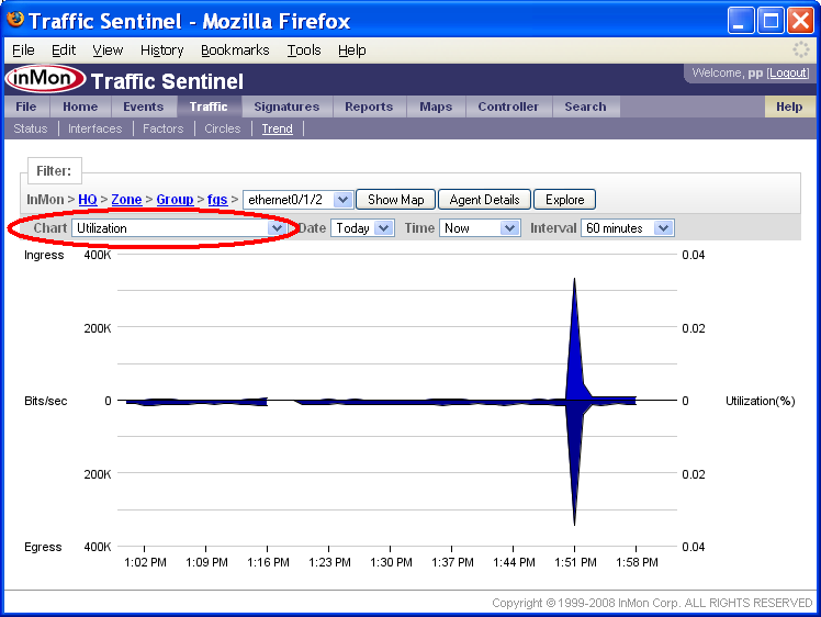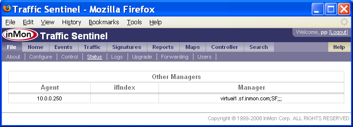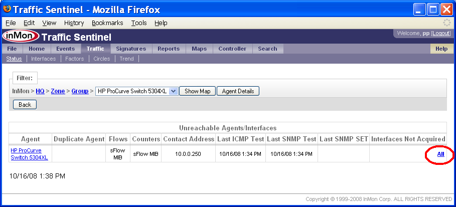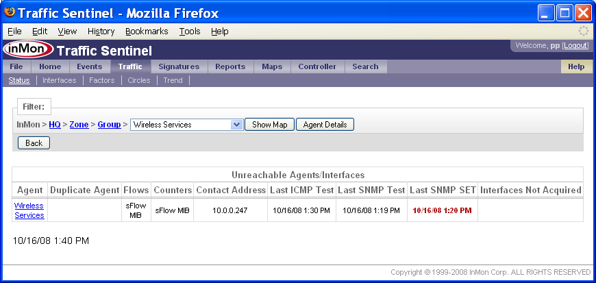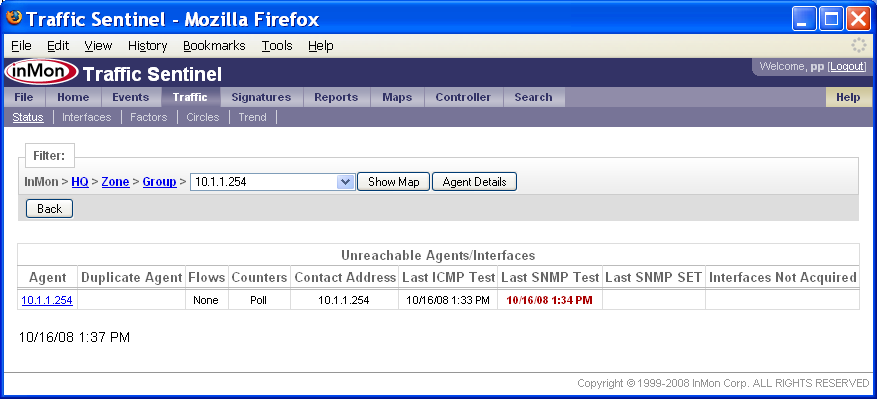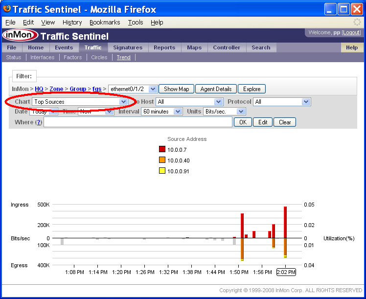 Agent(エージェント)ステータス・カラム(縦列)の丸で囲んだ「マージナル」ボックス■について、さらに調べてみる必要があります。 1つ目のエージェント、10.1.1.254には、No SNMP information available(SNMP情報が利用できない)とのメッセージが表示されています。これは、SNMP情報の取得に問題があることを示すものです。丸で囲ったステータス・ボックス■をクリックすると、下記の情報が表示されます。 このテーブルから、エージェントは存在するものの(なぜならば、ICMPテスト、「ping」テスト・メッセージには応答しているから)、SNMPテスト・メッセージには応答していないことが分かります。SNMP通信の問題は、このスイッチに対するTraffic Sentinel SNMPコンフィグレーション設定が正しくないために起きている可能性があります。あるいは、Traffic SentinelからのSNMPリクエストを、このスイッチが許可していないのかもしれません。 丸で囲った2つ目のステータス・ボックス(エージェント10.0.0.254に対応したもの)をクリックすると、下記の情報が得られます。 この例では、Flowsカラム、Countersカラムから、Traffic Sentinelが、sFlow MIBを用いてエージェントのsFlowモニタリングをコンフィグレーションしようとしていることが分かります。ICMPテスト、SNMPテストは成功しました。しかし、Interfaces Not Aquired(取得されなかったインターフェース)には、All(全て)と表示され、全てのスイッチ・インターフェースが、既に他のネットワーク・アプリケーションによってモニタリングされており、Traffic Sentinelからは利用できなかったことが分かります。All(全て)リンクをクリックすると、下記の情報が得られます。 Manager(管理者)値は、virtual1.sf.inmon.com;SF;;;となっており、sFlowエージェントが、既に、virtual1.sf.inmon.com上で実行されているソフトウェアによって使用中であることが分かります。virtual1.sf.inmon.com上のモニターをコンフィグレーションして、このエージェントを解放し、Traffic Sentinelによる取得ができるようにする必要があります。 丸で囲った3つ目のステータス・ボックス(エージェント10.0.0.247に対応したもの)をクリックすると、下記の情報が得られます。 この例では、Flowsカラム、Countersカラムから、Traffic Sentinelが、sFlow MIBを用いてエージェントのsFlowモニタリングをコンフィグレーションしようとしていることが分かります。ICMPテスト、SNMPテストは成功しましたが、SNMP SETテストは失敗しました。sFlow MIB経由でsFlowをコンフィグレーションするには、Traffic Sentinelが、SNMPリード/ライト・アクセスできる必要があります(つまり、SNMP SETオペレーションが実行できなければならないのです)。SNMP SETテストに失敗したことから、SETオペレーションを許可するようにスイッチがコンフィグレーションされていないか、あるいは、Traffic Sentinelが、SETオペレーションを行えるよう正しくコンフィグレーションされていないかの、どちらかだということが分かります。Traffic Sentinelは、SNMPリード・アクセスができません(SNMPテストに成功したことで、分かります)。 通信の問題が解決したら、カウンター情報やフロー情報が利用できるかどうかは、Traffic>Trend(トラフィック>トレンド)ページを使って確認できます。 エージェントfgsのステータスは、■色になっており、フロー情報、カウンター情報が利用可能であることを示しています。このスイッチで、インターフェースethernet0/1/2を選択し、Utilization(使用率)を選択すると、このスイッチのカウンター情報が収集されているのが分かります。 Top Sources(上位ソース)チャートを選択すると、このスイッチのフロー情報が収集されているのが確認できます。 5. 管理グルーピングを定義するネットワークを管理グループに分けることで、多数のネットワーク・デバイスを整理しやすくなります。加えて、デバイスをグループ分けすることで、デバイス・グループを選んで、異なる設定を適用できるようになります。 Traffic Sentinelは、2つのレベルの階層を備えています。トップ・レベルは、ゾーンです。各ゾーンには、グループが含まれ、各グループには、ネットワーク・エージェントが含まれます。この階層により、各エージェントは、単一のロケーションあるいはパスを持つことになります(つまり、1つのエージェントは、1つのグループにしか属することはできず、1つのグループは、1つのゾーンにしか属することはできません)。 エージェントをグループ分けする他に、ゾーンとグループによる階層は、IPアドレス・スペースの整理にも用いられます。アドレスをグループ分けすることで、ゾーン内あるいはゾーン間のトラフィックをレポートしたり、異なるホスト・グループに異なるポリシーを適用したり(例えば、データセンター内のサーバーについてのトラフィック・パターンやポリシーは、寮内の学生についてのトラフィック・パターンやポリシーとは、おそらく違っているでしょう)することが、やりやすくなります。 ネッ