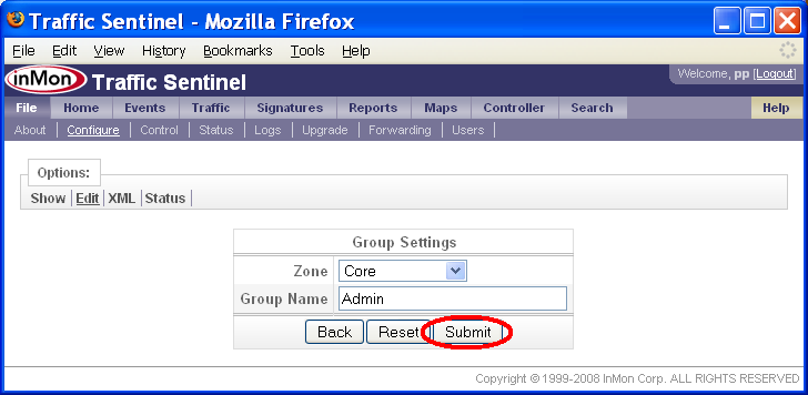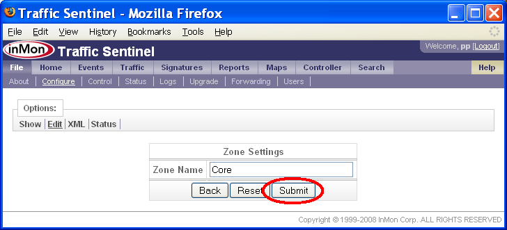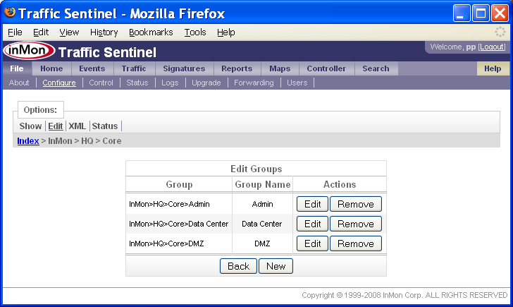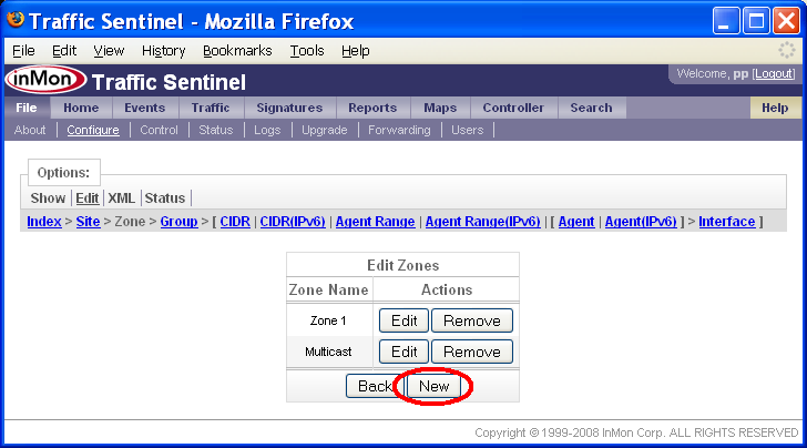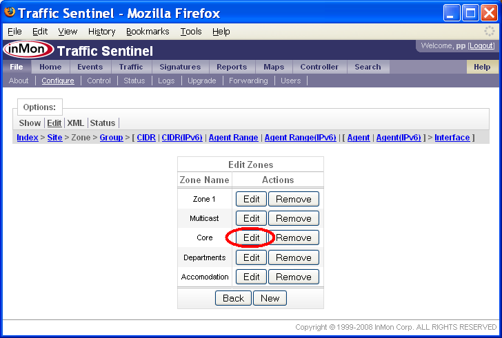 5.2 ゾーン、グループを作成する File>Configure>Edit(ファイル>設定>編集)ページで、ゾーンとグループの定義を行います。下記の例では、上述の5.1.1 大学で述べたゾーンとグループを作成します。 最初のステップは、ゾーンの定義です。ページ上端のZone(ゾーン)リンクをクリックするか、または、ページのGroupings(グルーピング)セクションのEdit Zones(ゾーンの編集)リンクをクリックします。 Edit Zones(ゾーンの編集)フォームでは、ゾーンの追加、削除、変更ができます。既に2つのゾーンが定義されていることに注目して下さい。1つ目はデフォルトのゾーン、Zone 1です。これは、Traffic Sentinelを初めて起動した時に作成されます。2つ目は、Multicast(マルチキャスト)です。これは、IPマルチキャスト・アドレスをキャプチャーするのに用います。 注: Zone 1ゾーンは削除しないで下さい。ゾーンを削除すると、それに含まれるコンフィグレーション要素も全て削除されてしまいます。コンフィグレーションが完了し、Zone 1の設定を移動した後で削除できます。 New(新規)ボタンをクリックして、新規ゾーンを定義します。 ゾーンの名称を入力するだけです。この例では、「Core」と入力し、Submit(サブミット)ボタンをクリックすると、ゾーンが作成されます。このステップを繰り返して、全てのゾーンを追加します。この例では、ゾーンは、「Core」、「Departments」、「Accommodation」です。 これでゾーンが定義されました。次に、グループを追加します。 この例では、「Core」ゾーンから始めています。ゾーンの隣のEdit(編集)ボタンをクリックして下さい。 Zone Settings(ゾーンの設定)フォームでは、ゾーンにさまざまな設定を適用できます。この例では、ゾーンにグループを追加しようとしているので、Edit Groups(グループの編集)の隣のEdit(編集)ボタンをクリックします。 Edit Groups(グループの編集)フォームでは、先にゾーンを追加したのと同様に、グループを追加できます。 注: ページ上端のIndex > InMon > HQ > Core パスから、Core ゾーン内のグループを編集していることが分かります。 New(新規)ボタンをクリックして、グループを追加します。 この例では、「Admin」という名のグループを、「Core」ゾーン内に追加しようとしています。Submit(実行)ボタンをクリックして、「Admin」グループを追加します。そのまま続けて、全てのグループ(この例では、「Admin」、「Data Center」、「DMZ」)をゾーンに追加します。 このプロセスを繰り返します。残りのゾーンにも、全てのグループを追加します。 6. アドレス・スペースをリストアップするホスト・アドレスをグループ分けすることで、トラフィック・パターンが理解しやすくなります。ローカルに割り当てられた全てのアドレスをリストアップすれば、トラフィックがローカルかノンローカルかが判別できます。異なるグループにアドレスを割り当てることで、グループやゾーン内、およびグループやゾーン間のトラフィックの分析が可能になります。例えば、この説明書では、大学のネットワークを、異なるグループとゾーンに分けました。Accommodationのアドレスなのか、それとも大学のDepartmentsやCore管理機能のアドレスなのかが識別できれば、これら異なるグループに対するネットワーク利用ポリシーを構築し、それを守らせることが容易になります。例えば、ピア・ツー・ピア・アプリケーションを実行させている学生に対して、彼が利用する回線容量を制限したり、あるいは、大学の管理コンピュータへのアクセスに、より厳しいコントロールを課したりしたいと考えるかもしれません。 Traffic Sentinelでは、IPアドレスのグループを定義するのに、クラスレス・インタードメイン・ルーティング(CIDR)を利用しています。CIDR表記法では、IPアドレスのグループは、ネットワーク(IP)アドレスと、そのグループのメンバーが共有するアドレスからの有効なビット数を示すマスク・ビット数を用いて定義されます。例えば、CIDR 10.1.4.0/24では、10.1.4プリフィックスを共有する全てのアドレス、すなわち、10.1.4.0/255.255.255.0サブネット上に存在する全てのアドレスがグループ分けされます。CIDRの優先順位を説明するため、IPアドレス、10.1.4.1について考えてみましょう。2つのCIDR、10.1.4.0/24と10.0.0.0/8が定義されているとします。IPアドレスは、これらCIDRの両方に含まれていますが、CIDR、10.1.4.0/24の方が、より限定的なアドレス・グループであり、したがって、10.0.0.0/8 CIDRよりも優先されます。 CIDRは、アドレス・グループを指定するのに極めて有効な方法です。目的は、ネットワーク内の全ての詳細なサブネットを反映することです。CIDRを用いてサイトのサブネット・ポリシーを記述することではありません。例えば、5.1.1 大学の大学ネットワークが、プライベートの10.0.0.0/8アドレス・スペースを利用しているとします。このサイトが取りうるアドレス割り当てポリシーは、次の表のようになります。