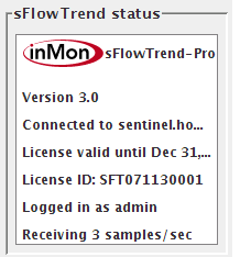 To the right of the InMon Corp. logo is the product name. This should be sFlowTrend-Pro if you are running sFlowTrend-Pro, or sFlowTrend if running basic sFlowTrend. Also, if you are running sFlowTrend-Pro, information about the current license is shown, including the expiry date, and the license ID number. If you have multiple copies of sFlowTrend-Pro, the license ID is useful if you need to refer to the license you are running when you are using the InMon customer portal (//www.myinmon.com).