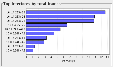 These show, in bar chart format, the top 10 switch interfaces sorted by utilization, total frames (unicasts, multicasts and broadcasts), and errors and discards. The bar shows the average over the previous minute. These charts are designed to give you a summary view of the busiest interfaces, or interfaces which are experiencing the highest number of issues. Clicking on any of the bars allows you to quickly drill-down to the traffic charts for that specific interface.