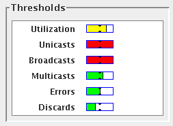 Each threshold category (Utilization, Unicasts, Broadcasts, Multicast, Errors, Discards) indicates the most severely violated threshold across all the switches that you are monitoring. The colour of the bar indicates how severe the threshold violation is (green is normal, yellow is marginal and red critical). Further detail of the threshold value is indicated by how far to the right the threshold bar is within the indicator. For more information on how thresholds work, see Chapter 6, Using and configuring thresholds.