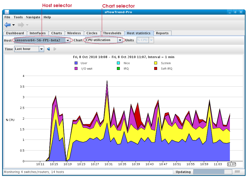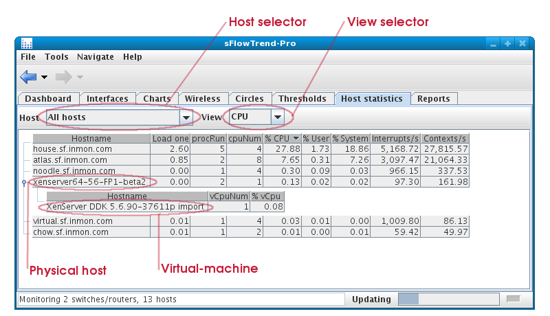 ”ホスト統計値”タブは、sFlowTrend-ProにHost sFlowを送信しているホストに対して、ホストパフォーマンス統計値を提供します。このタブは、ホストパフォーマンスデータに対して2つのビューを提供します。: