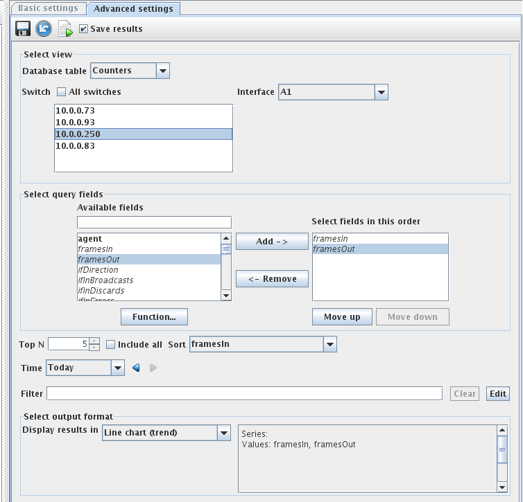 field)の場合もあれば、bytesTotalのようなバリュー(値)・フィールド(value field)の場合もあります。テーブル内のそれぞれの列は、ユニークな組み合わせのキーと、その組み合わせに関連したバリュー(値)を表します。例えば、クエリーが、sourceAddressとbytesTotalの2つのフィールドを持つように定義されたら、クエリーが作成するデータ・テーブルでは、テーブル内のそれぞれの列には、ユニークなソース・アドレスと、そのアドレスから送られたバイト数が含まれます。sFlowTrend-Proは、基本設定を用いた一般的、基本的なクエリーと、詳細設定を用いたフレキシブルで複雑なクエリーの両方をサポートしています。