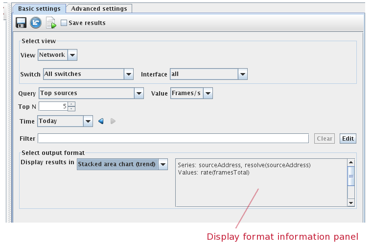 クエリーを全てパラメータ化したら、セレクターの「結果の表示(Display results)」で表示フォーマットを選択し、どのように結果を表示するかを決めます。表示フォーマットを選択すると、sFlowTrend-Proは、クエリーが生成したデータが、どのように表示されるかを分かりやすく示します。例えば、バー・チャート(トータル)が選択されたら、どのフィールドがカテゴリー(バー)に用いられ、どのバリュー・フィールドが、バーの高さを決めるのに用いられるのかを、表示フォーマット情報パネルに表示します。