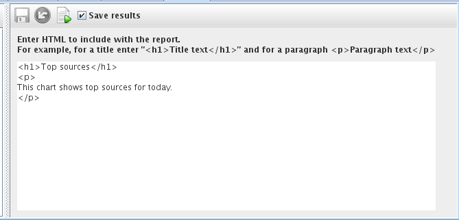 レポート・ブラウズ・ペインでHTMLセクションを選択すると、レポート・セッティング・ペインが表示されます。HTMLセクションを利用して、フォーマットされた、あるいはフォーマットされていないコンテンツをレポートに含めることができます。例えば、クエリー・セクションで作成されたチャートにタイトルとディスクリプションを表示したい時には、クエリー・セクションの前に、HTMLセクションを挿入します。その後、HTMLセクションの設定を次のように編集します。: