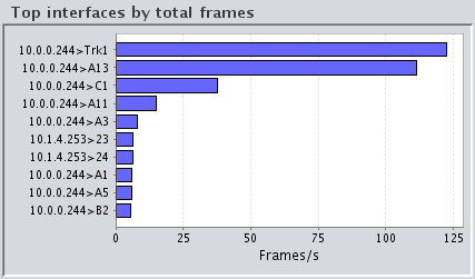 These show, in bar chart format, the top 10 switch interfaces sorted by utilization, total frames (unicasts, multicasts and broadcasts), and errors and discards. The bar shows the average over the previous minute. These charts are designed to give you a summary view of the busiest interfaces, or interfaces which are experiencing the highest number of issues. Clicking on any of the bars allows you to quickly drill-down to the traffic charts for that specific interface.