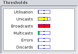 Each threshold category (Utilization, Unicasts, Broadcasts, Multicast, Errors, Discards) indicates the most severely violated threshold across all the switches that you are monitoring. The colour of the bar indicates how severe the threshold violation is (green is normal, yellow is marginal and red critical). Further detail of the threshold value is indicated by how far to the right the threshold bar is within the indicator. For more information on how thresholds work, see Chapter 6, Using and configuring thresholds.