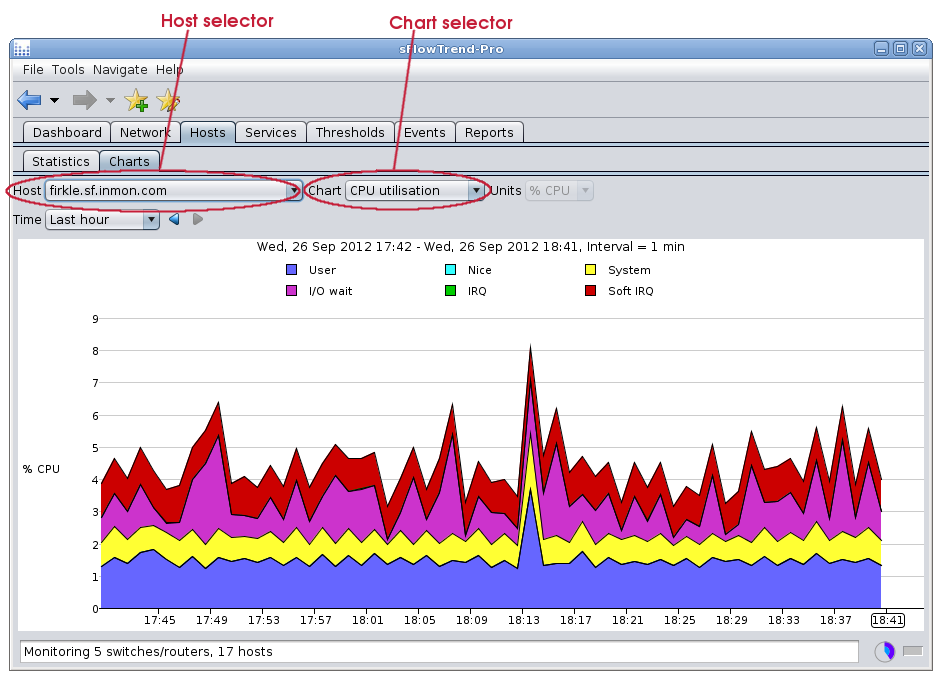 Sometimes one performance counter value can be much smaller than the other performance counters, making it hard to see the the smaller counter value trend. In this case, you can view the trend for only the smaller counter, by clicking on the legend item corresponding to the counter of interest. For example, when viewing the CPU Utilization chart, clicking with the mouse button on I/O wait will change the chart to display only the trend for percent of CPU time spent waiting for IO; an additional trend line for the % of CPU time spent executing user processes can be added to the chart using Shift+ mouse button on User; or clicking with the mouse button on I/O wait or the background of the legend area will cause all trend lines to be displayed again.