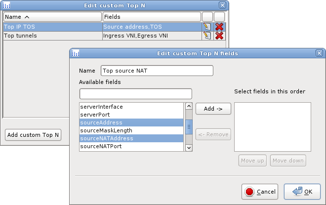 For example, if you would like to see the top source addresses before NAT has taken place and the associated addresses after NAT, select sourceNATAddress from the Available fields list and click Add -> to add this key field to the selected fields list, then select and add sourceAddress. See Table 16.1, “Database key fields available for flows” for descriptions of the available fields. You must enter a unique name for this custom Top N, before you click OK. After you click OK in the Edit custom Top N dialog, the custom Top N will be selected in the Chart selector and the corresponding custom Top N chart displayed. Custom Top N charts are listed after the standard Top N charts in the selector. You can use the Edit custom Top N dialog to edit or remove existing custom Top N definitions.